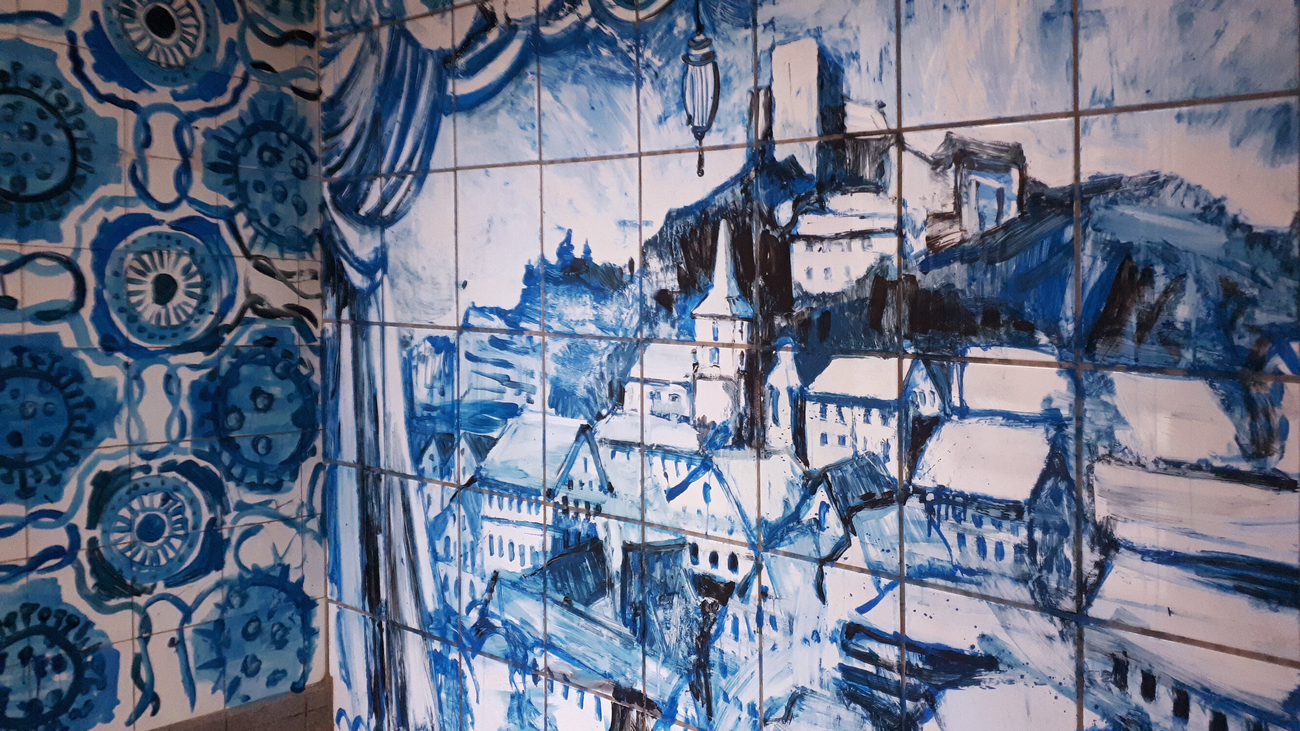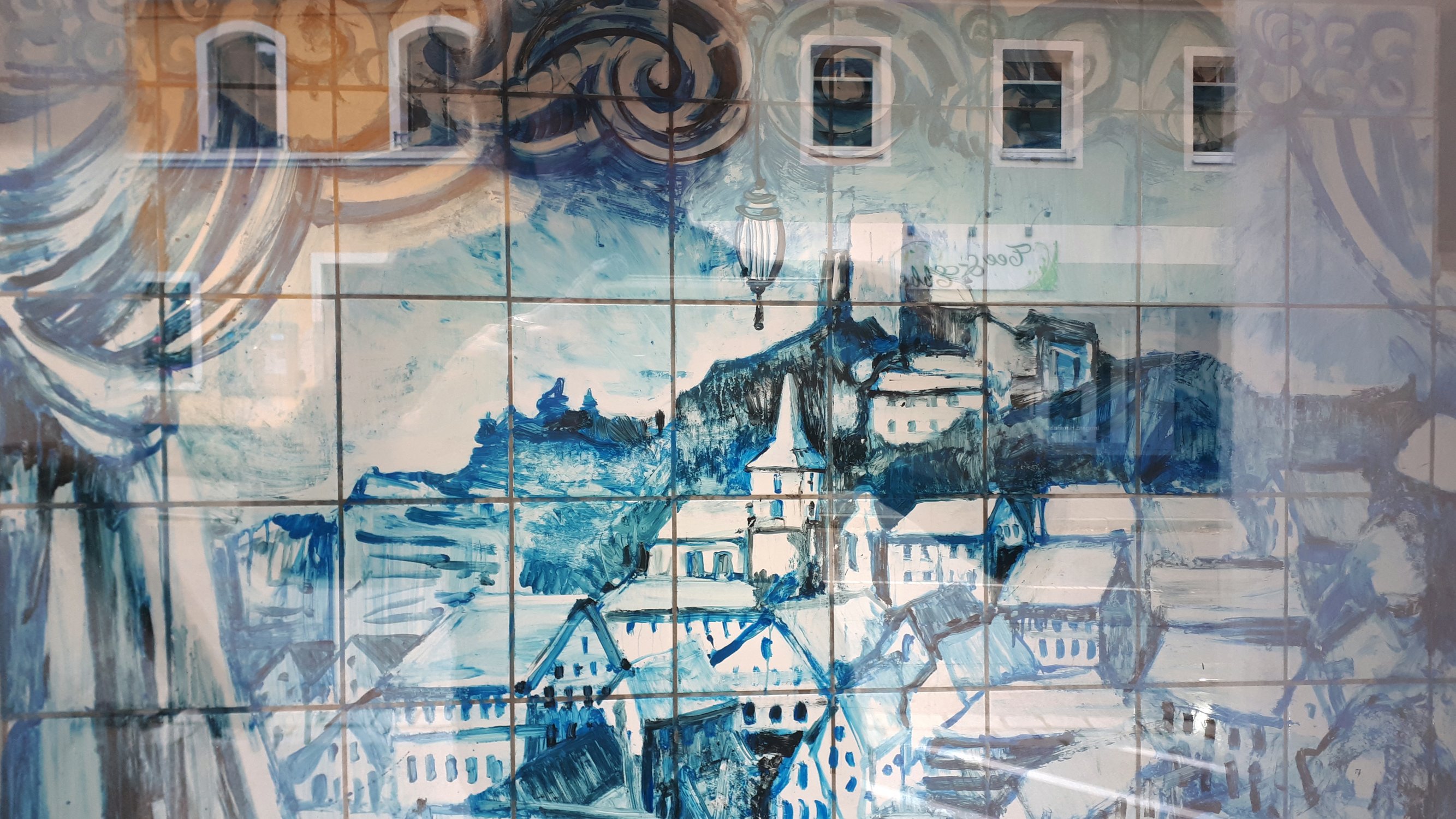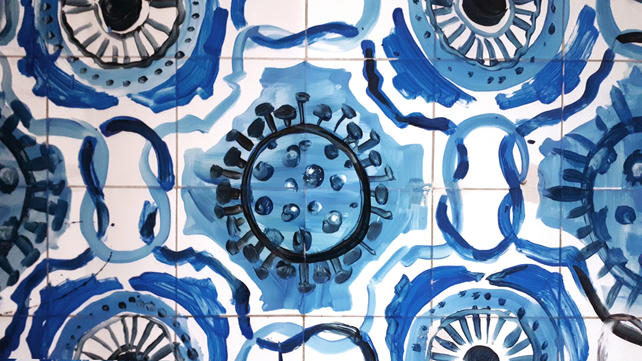 Susanne Neumann besetzt eine leerstehende Pizzeria und nutzt den gefliessten Raum für eine Maiolica Installation: sie bemalt die Fliesen mit blauer Farbe und holt so Lissabons Keramikfliesen - Azulejos - in den Ortskern von Falkenstein. Thema der Malerei: Corona und Falkenstein