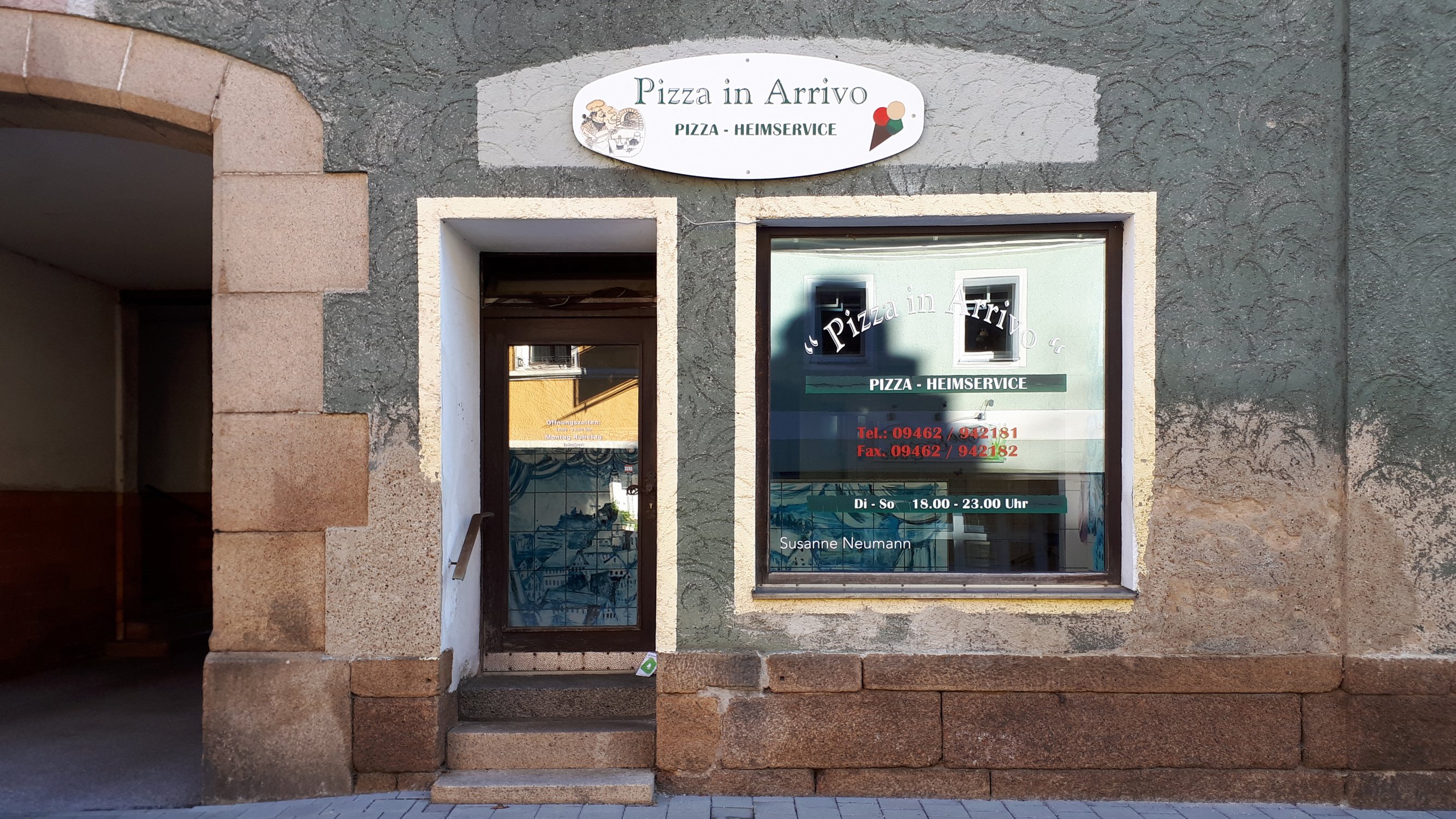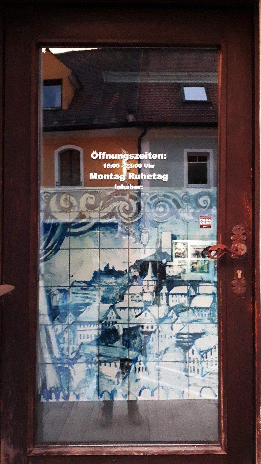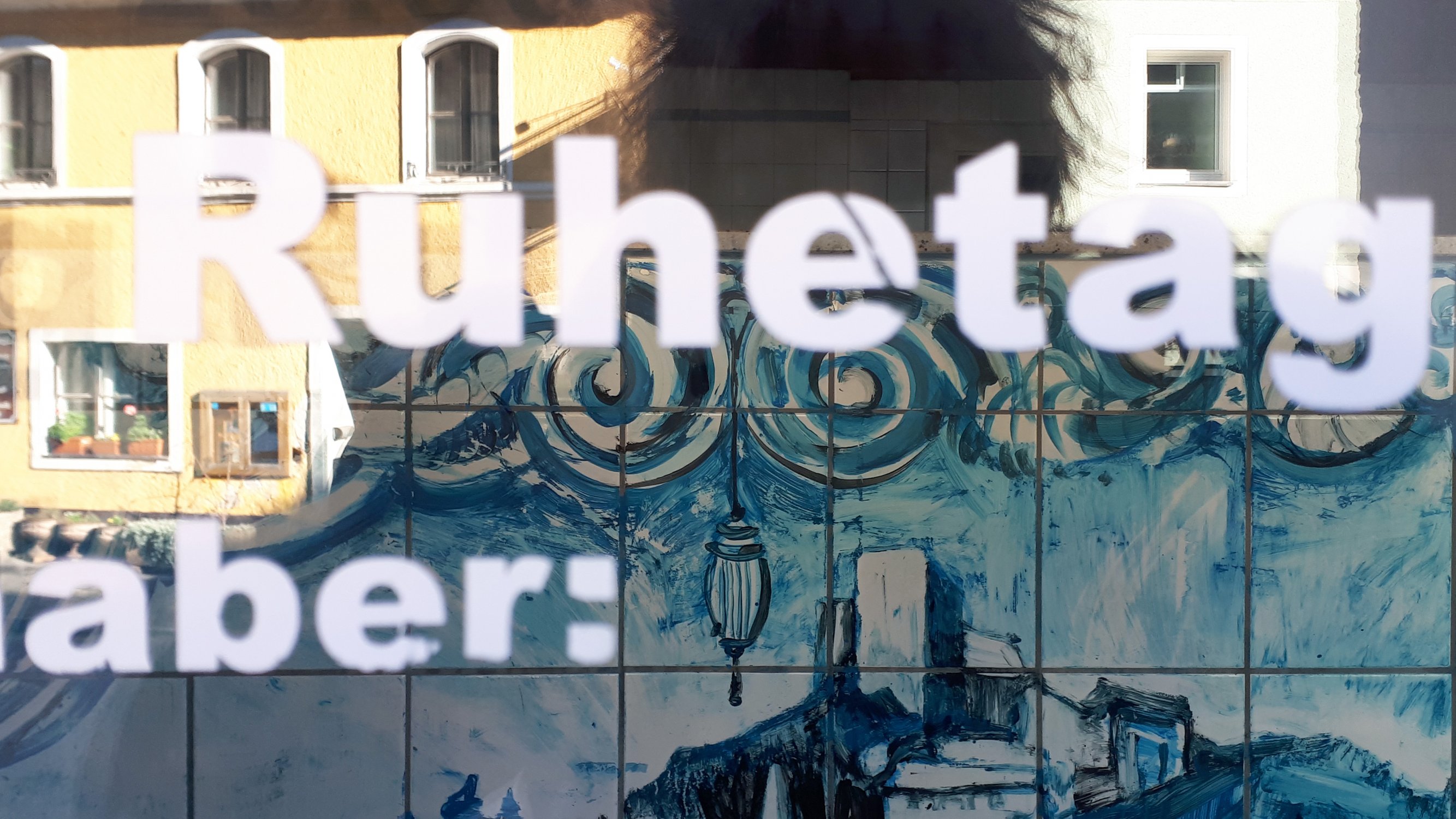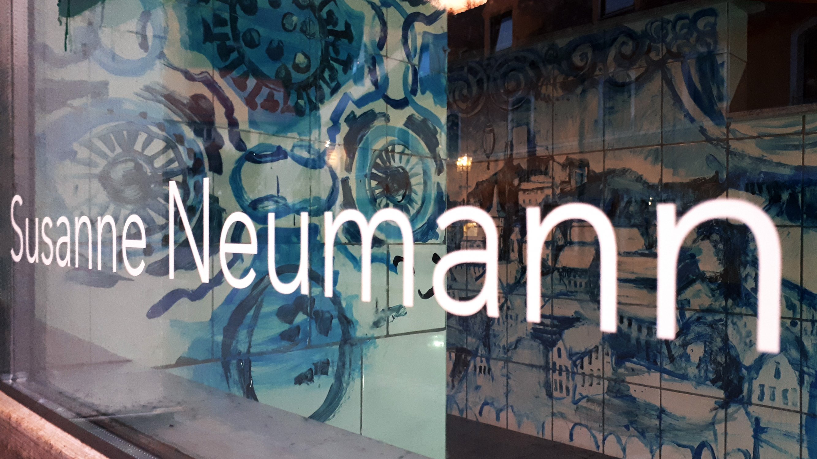 Susanne Neumann besetzt eine leerstehende Pizzeria und nutzt den gefliessten Raum für eine Maiolica Installation: sie bemalt die Fliesen mit blauer Farbe und holt so Lissabons Keramikfliesen - Azulejos - in den Ortskern von Falkenstein. Thema der Malerei: Corona und Falkenstein
