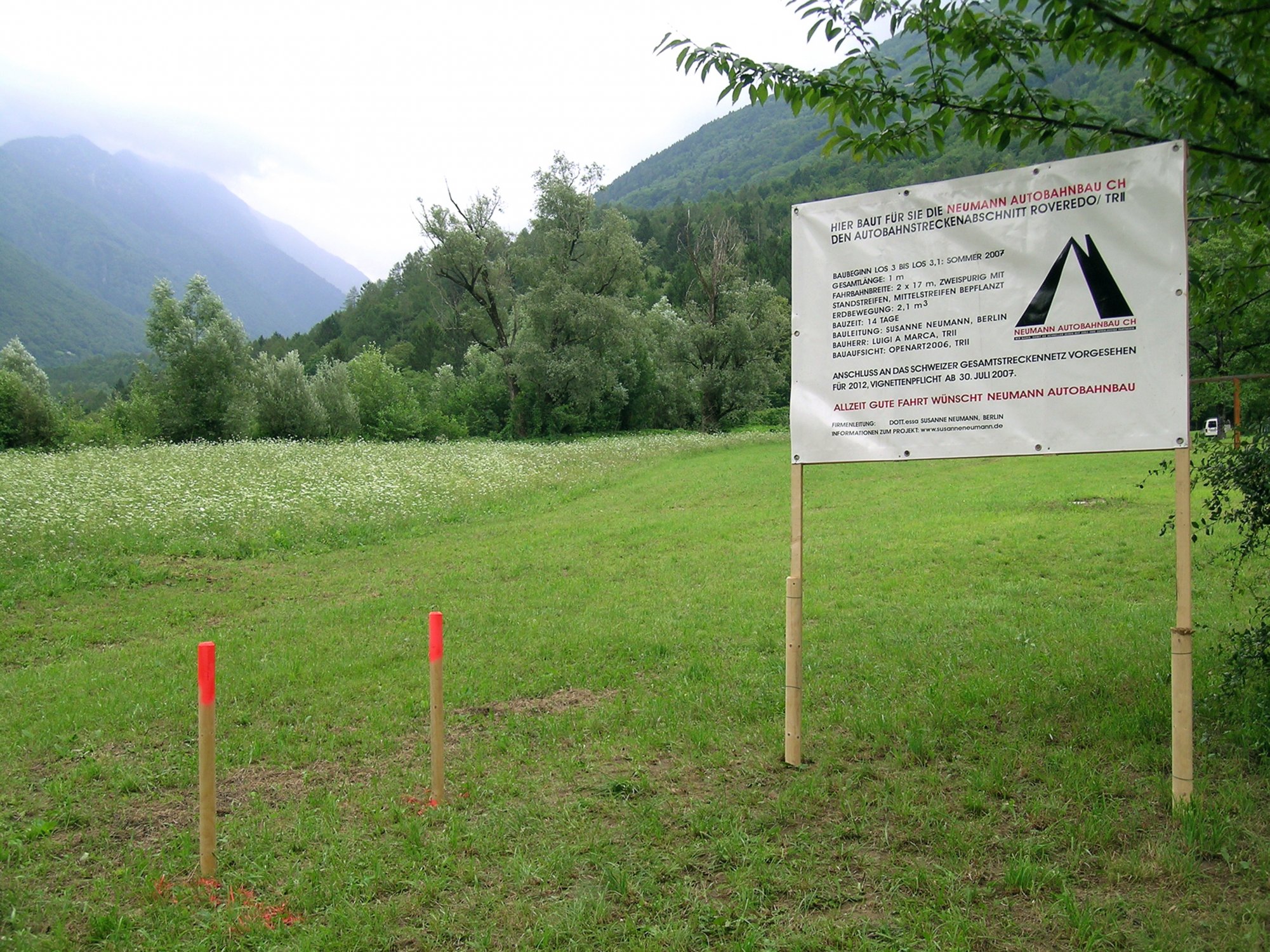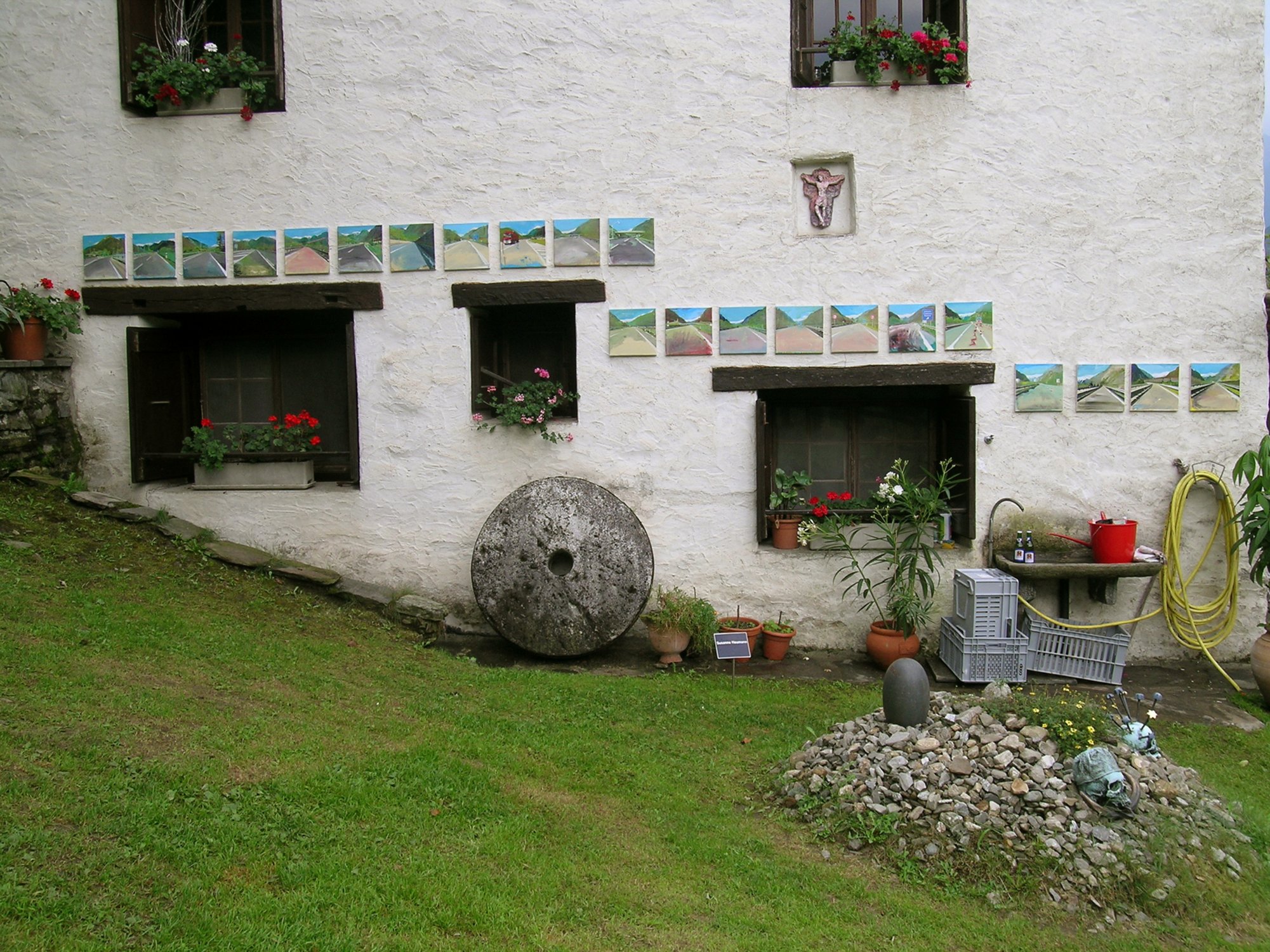Im Kellerraum der Mühle hatte ich eine Installation eingerichtet. Die Arbeit beschreibt eine fiktive Verlegung der Autobahntrasse im Mesolcinatal und alle dazu erforderlichen Baumassnahmen, von den Vermessungsarbeiten, über Erdbewegungen bis hin zu Sprengungen und der Kanalqualitätssicherung. Landestypische Souvenirartikel und Postkarten zum Thema "Autobahn" ergänzen die Installation.
