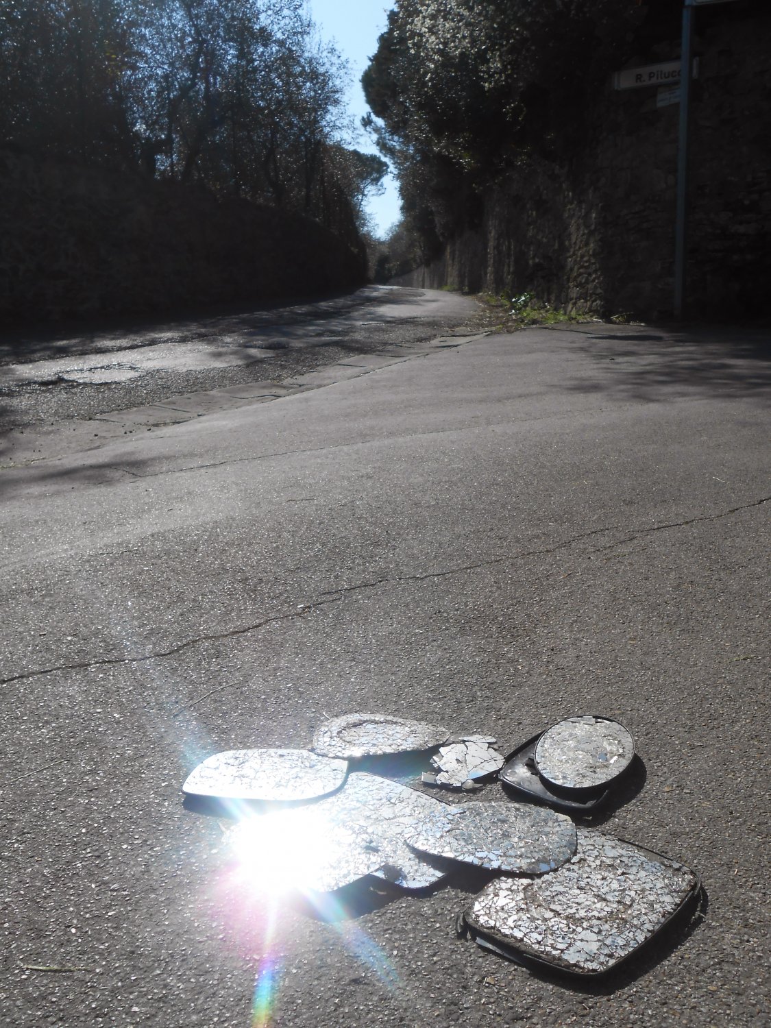 Fundort: eine enge Verbindungsstraße zwischen Firenze Sud und Scandicci (Via delle Bagnese); ein Villenvorstadtviertel mit hohen Mauern und großem Verkehrsaufkommen und die perfekte »scorciatoia« zwischen Firenze und Scandicci; der Preis der Abkürzung – tausendfach abgerissene Autorückspiegel. Die Enge der Straße lässt keine zwei Autos sich aneinander vorbeischiebend zu – geschweige denn ein zusätzliches Hindernis in Form einer Sammlerin. Somit wurden die Sammlungseinsätze (2000 – 2012) jedes Mal zu einem gefährlichen Unterfangen. Die silbrig glitzernden Rückspiegelfragmente im Straßenranddreck als märchenhaft-mythisches Relikt einer bizarren Periode der Menschheitsgeschichte, deren Kennzeichen nicht die Schnurkeramik ist, sondern die Autobahn mit ihrer Verheißung auf Freiheit, Mobilität und Geschwindigkeit. Immer mit dabei Dorothey Lewitt aus London, die 1909 in ihrem Werk »The Woman and the Car: A Chatty little Handbook for the Edwardian Motoriste« den Autofahrerinnen folgenden Ratschlag an und in die Hand gab: »Frauen sollten an geeignetem Platz im Auto einen kleinen Handspiegel mitführen und ihn von Zeit zu Zeit hoch nehmen, um während der Fahrt im Verkehr nach hinten zu blicken.«